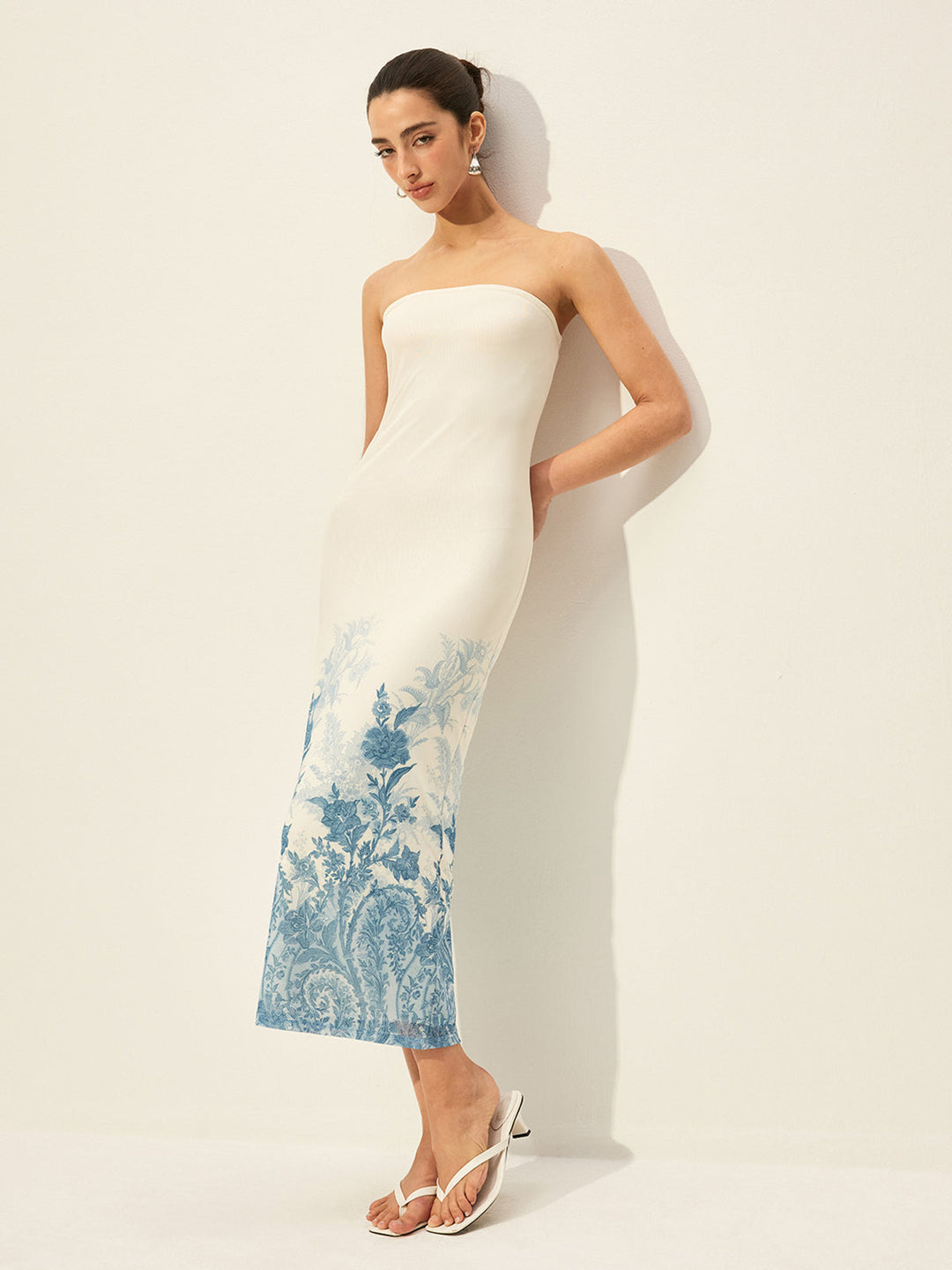 Straplez Çiçek Desenli Uzun Elbise Kırık Beyaz