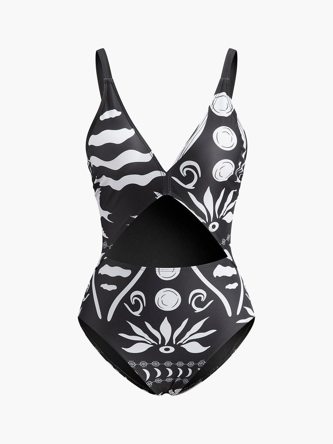 Baskılı Kesikli V Yaka Tek Parça Mayo Siyah