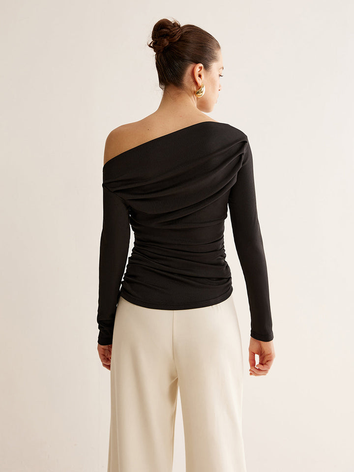Asimetrik Yaka Pileli Uzun Kollu Üst