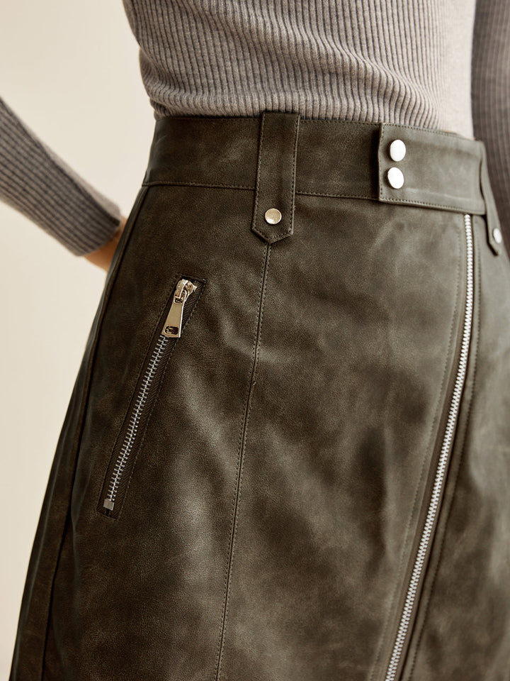 Asimetrik Fermuarlı Cepli Suni Deri Etek