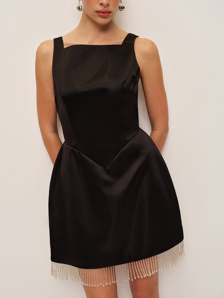 Boncuklu Saçaklı Saten V Yaka Elbise