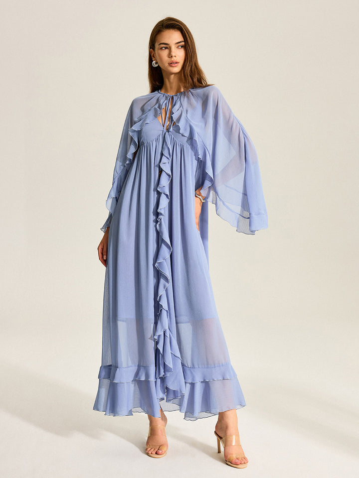 Yarı Şeffaf Pelerin İki Parçalı Fırfırlı Şifon Elbise