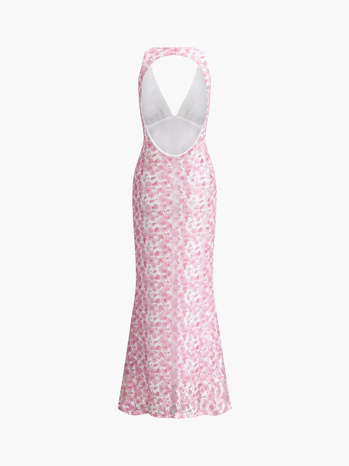 Kiraz Çiçeği Askılı Sırt Dekolteli Uzun Elbise