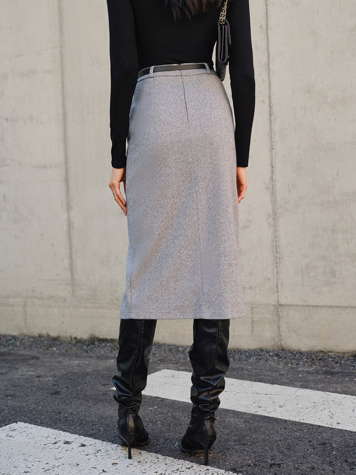 Kemersiz Şevron Yırtmaçlı Midi Etek