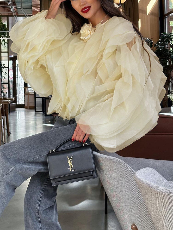 Yarı Şeffaf Şifon Fırfırlı Yuvarlak Yaka Bluz