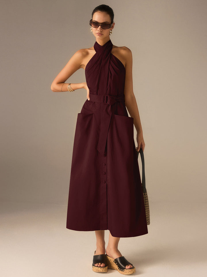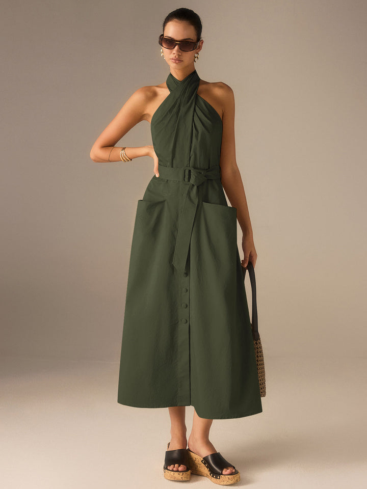 Pamuklu Pileli Askılı Yaka Kemerli Midi Elbise