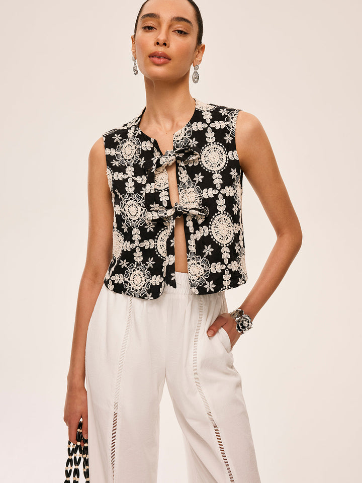 İşlemeli Pamuklu Önden Bağlamalı Yelek