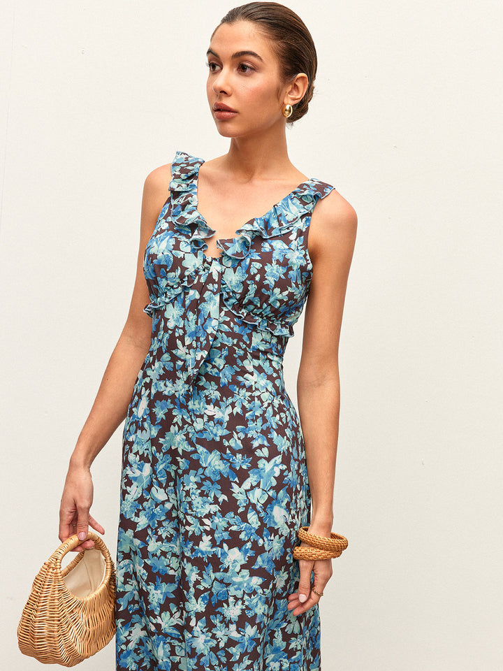 Çiçekli Marul Kenarlı V Yaka Fermuarlı Elbise