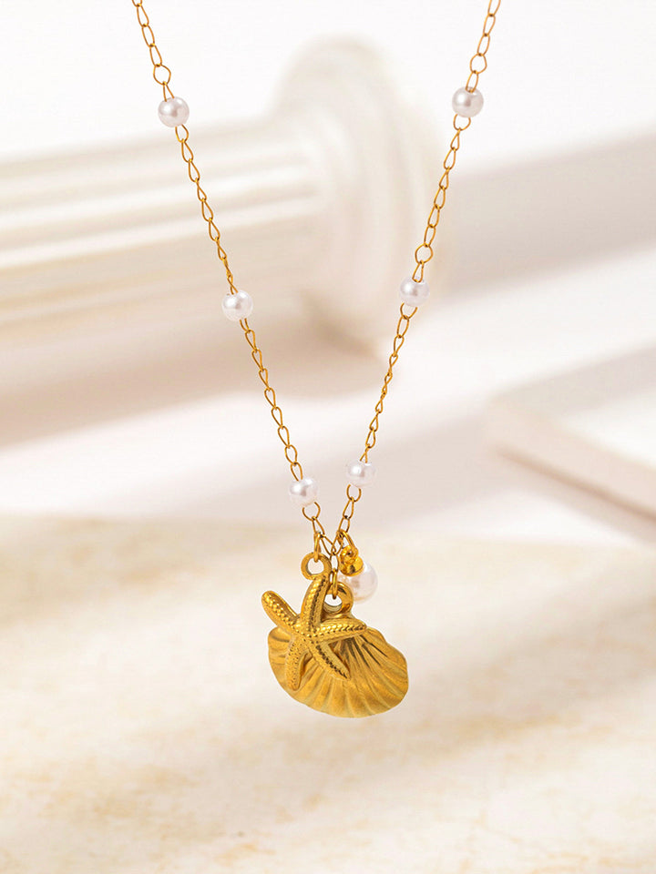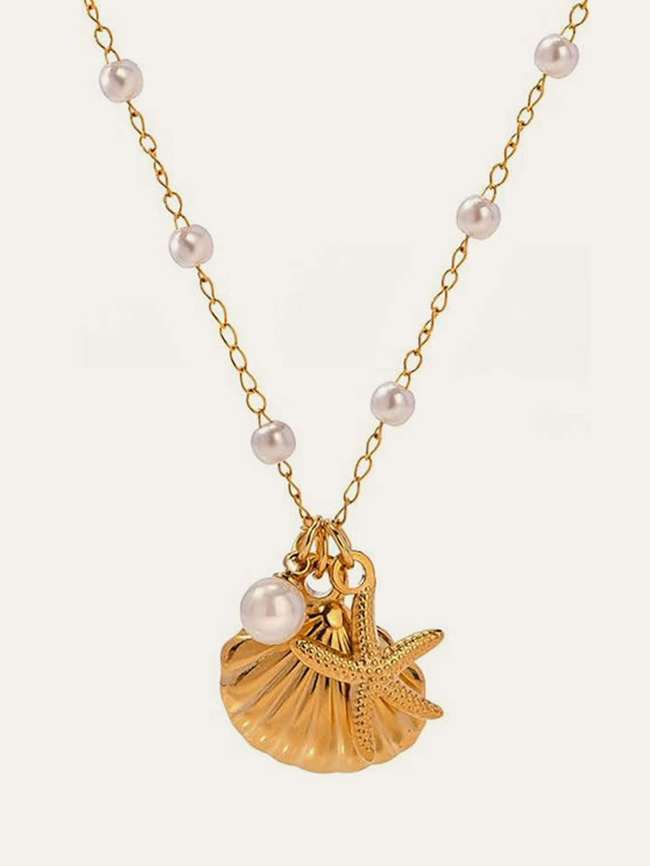 İncili Altın Deniz Kabuğu Ve Deniz Yıldızı Kolye