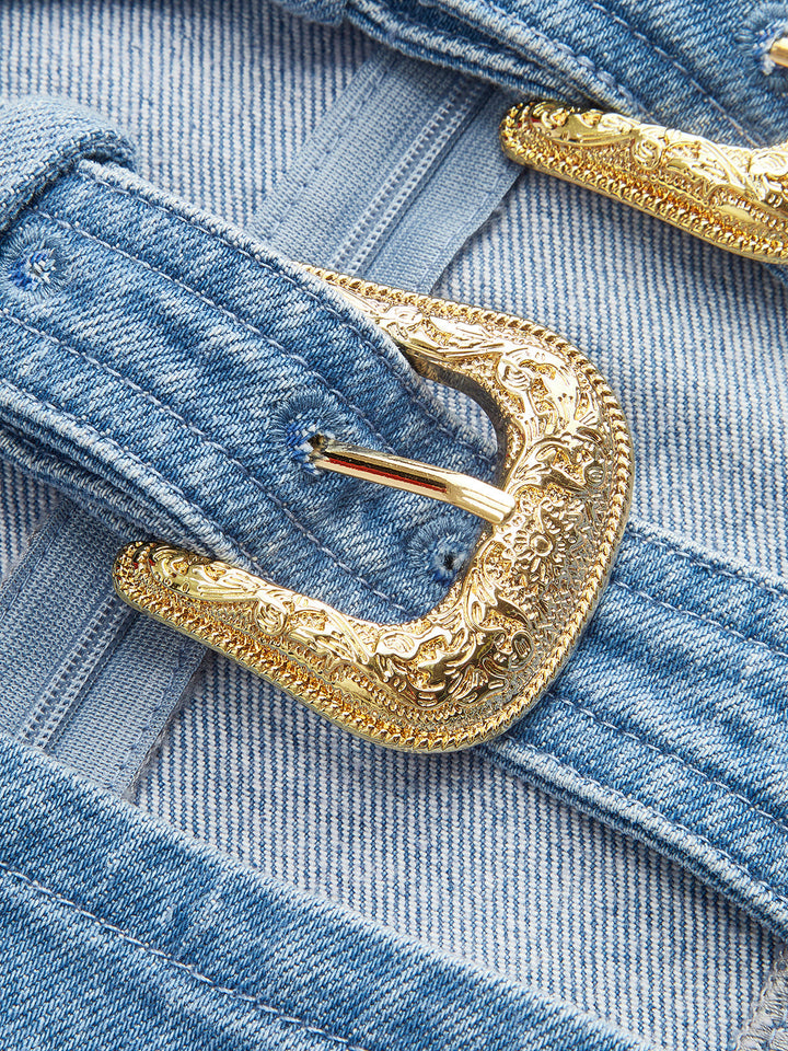 Boyundan Bağlamalı Toka Detaylı Kot Elbise