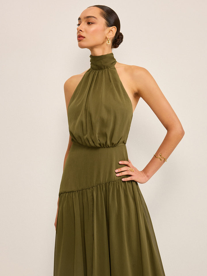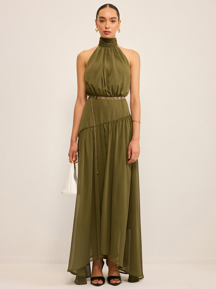 Sırtı Fiyonklu Yarı Şeffaf Askılı Şifon Uzun Elbise
