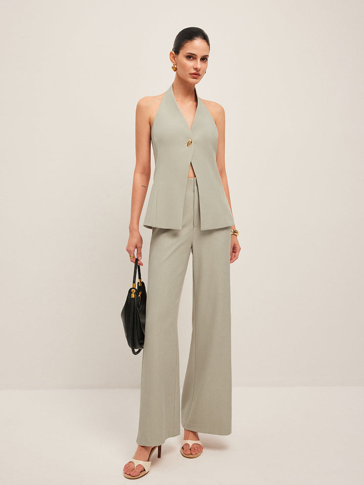 Boyundan Bağlamalı Metal Düğme Detaylı Sırtı Açık Yelek