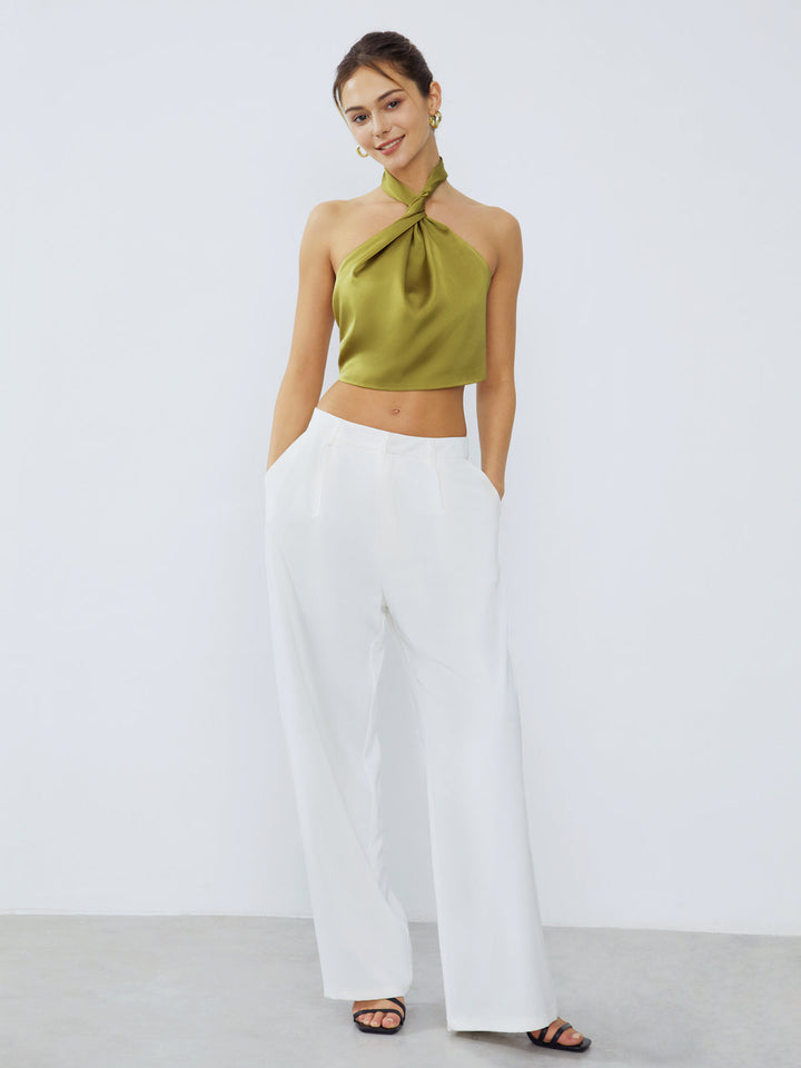 Halter Yaka Bükümlü Açık Sırtlı Saten Kısa Üst