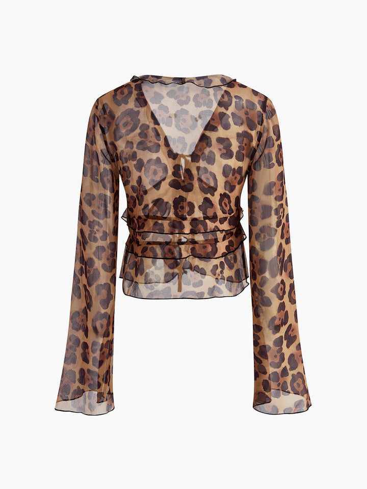 Leopar Desenli Yarı Şeffaf Volanlı V Yaka Bluz