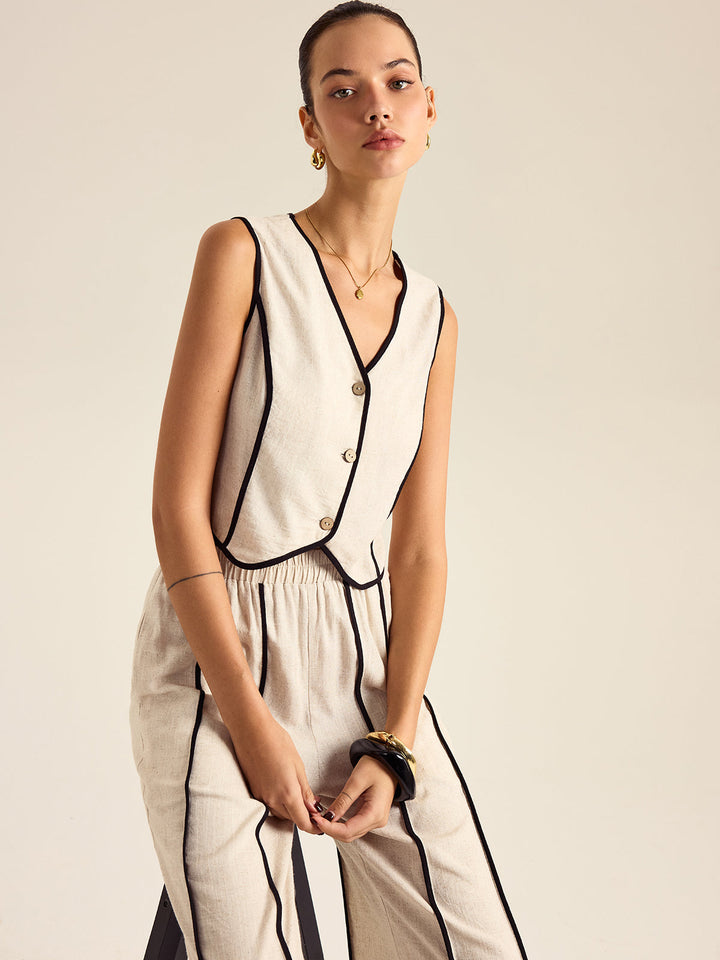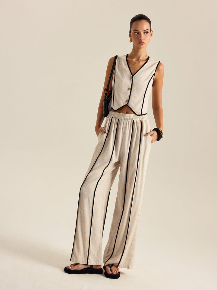 Lastikli Bel Keten Ve Pamuklu Çizgili Pantolon Takımı