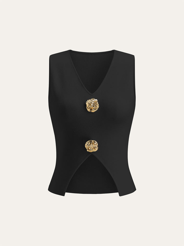 Metal Detaylı V Yakalı Yırtıklı Kazak Yelek