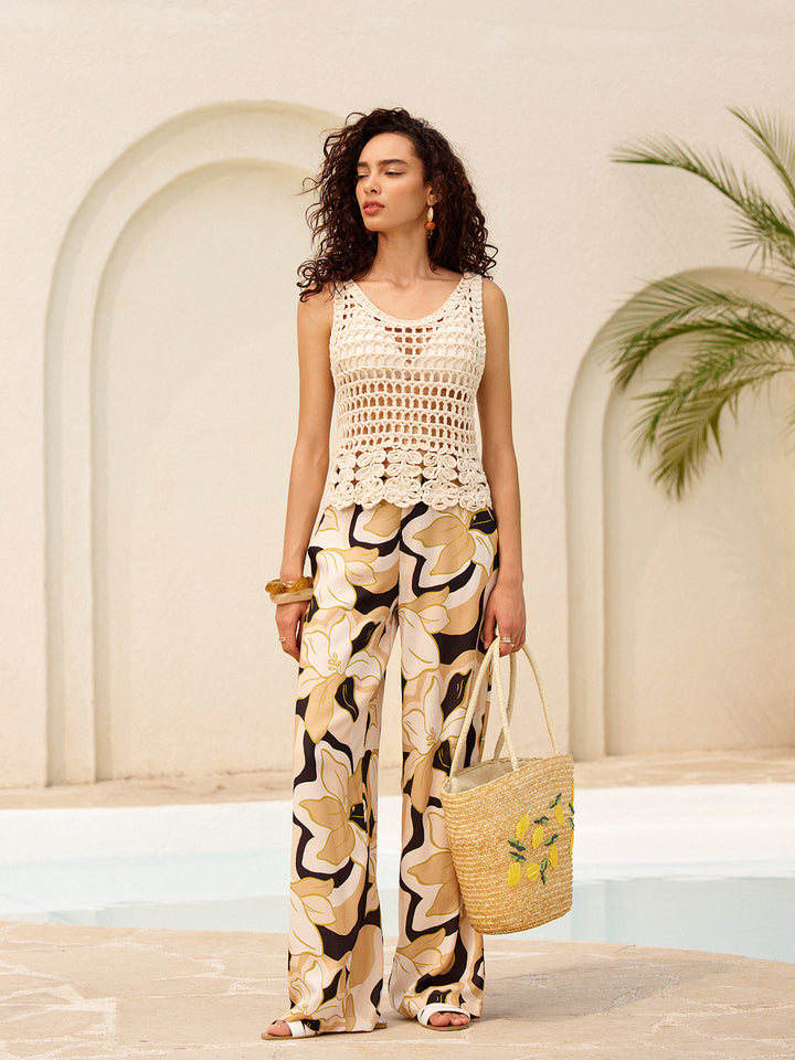 Orta Bel Çiçek Desenli Cepli Pantolon