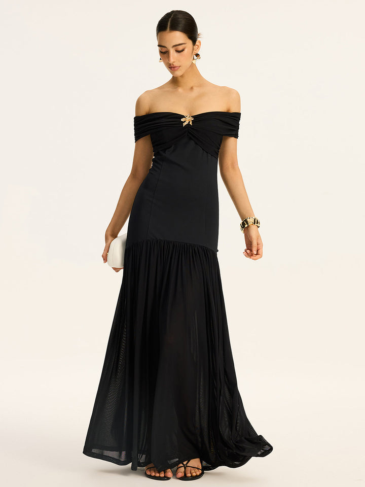 Yarı Şeffaf Omuzdan Bağlamalı Dosya Panelli Uzun Elbise