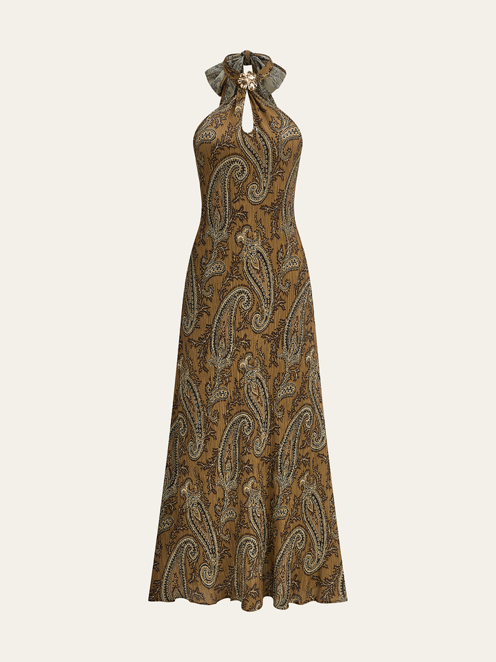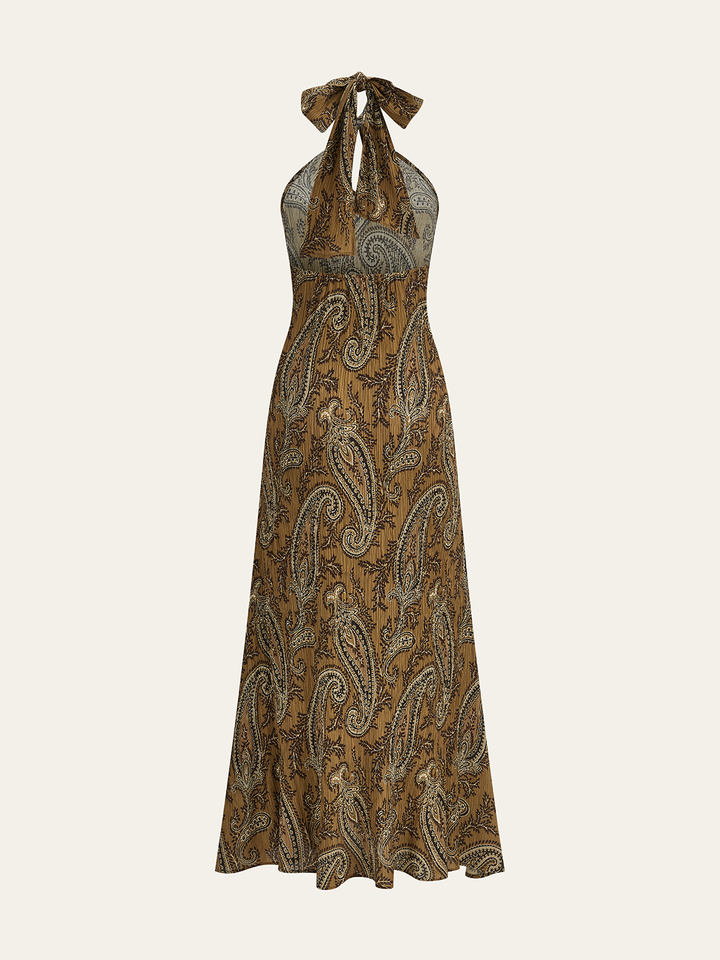 Paisley Desenli Askılı Sırtı Açık Uzun Elbise