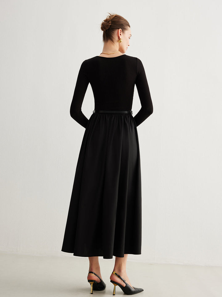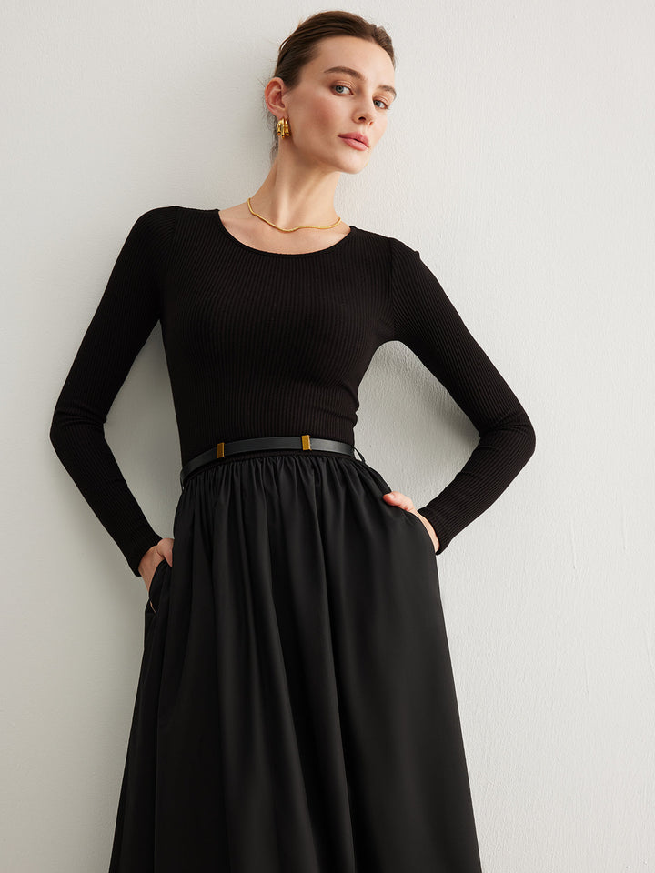 Düz Kemerli Pileli Panel Elbise