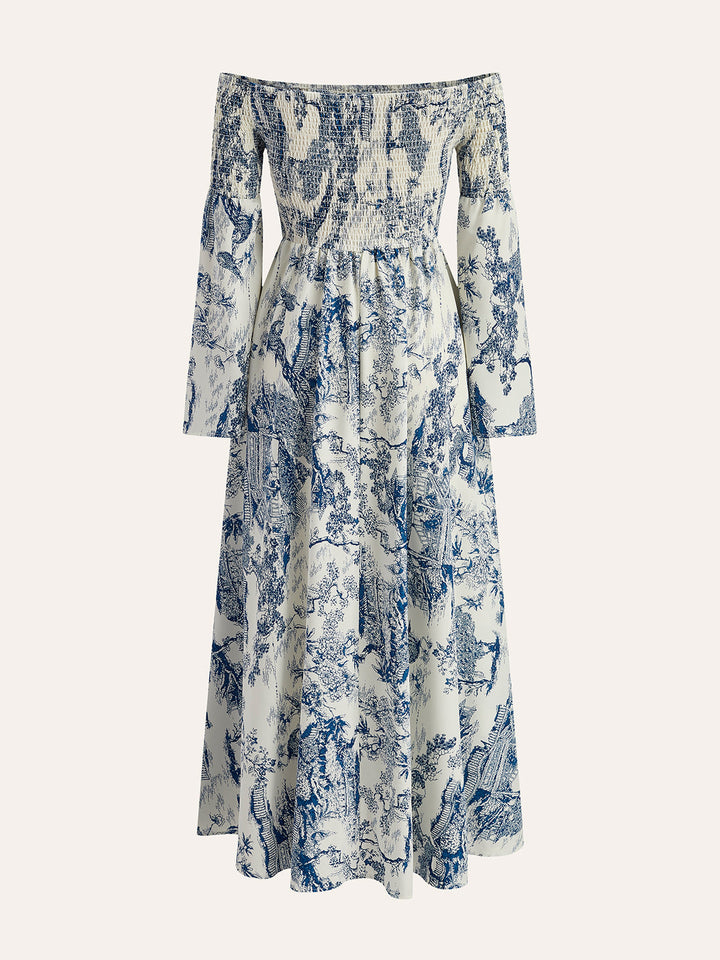 Baskılı Omuz Açık Fırfırlı Kollu Elbise