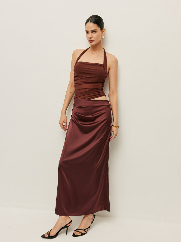 Büzgülü Boyundan Bağlamalı Kesim Detaylı Elbise