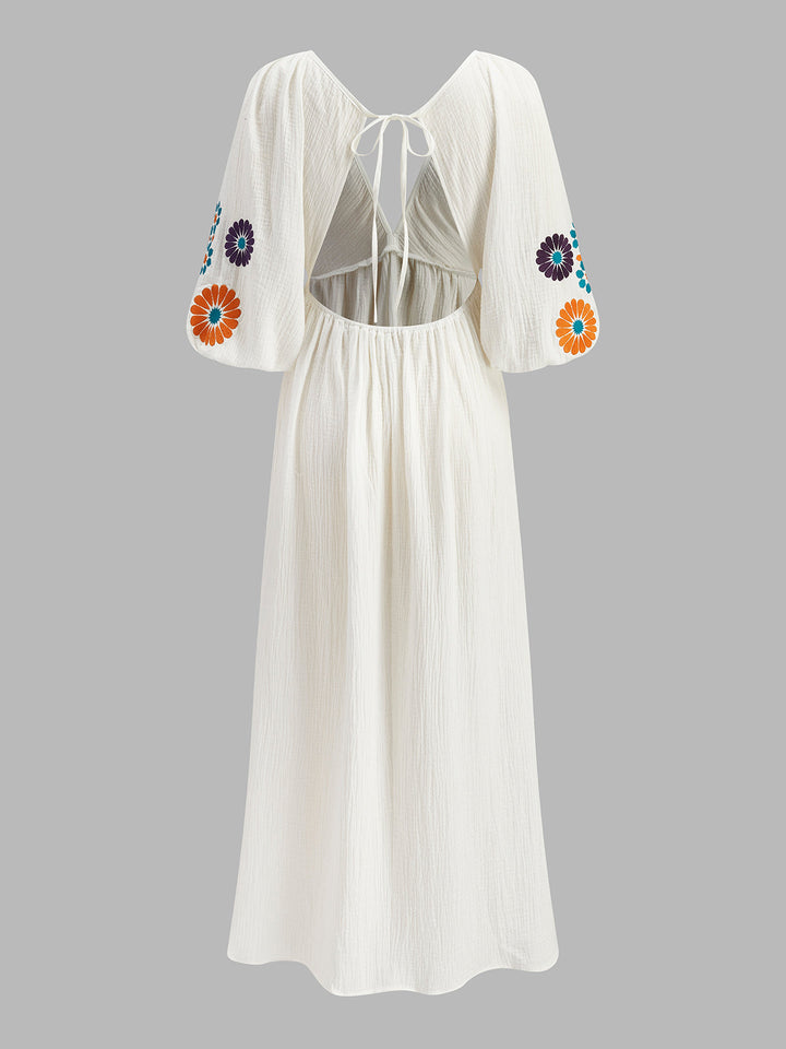 Yarı Şeffaf Nakışlı V Yakalı Çiçekli Elbise