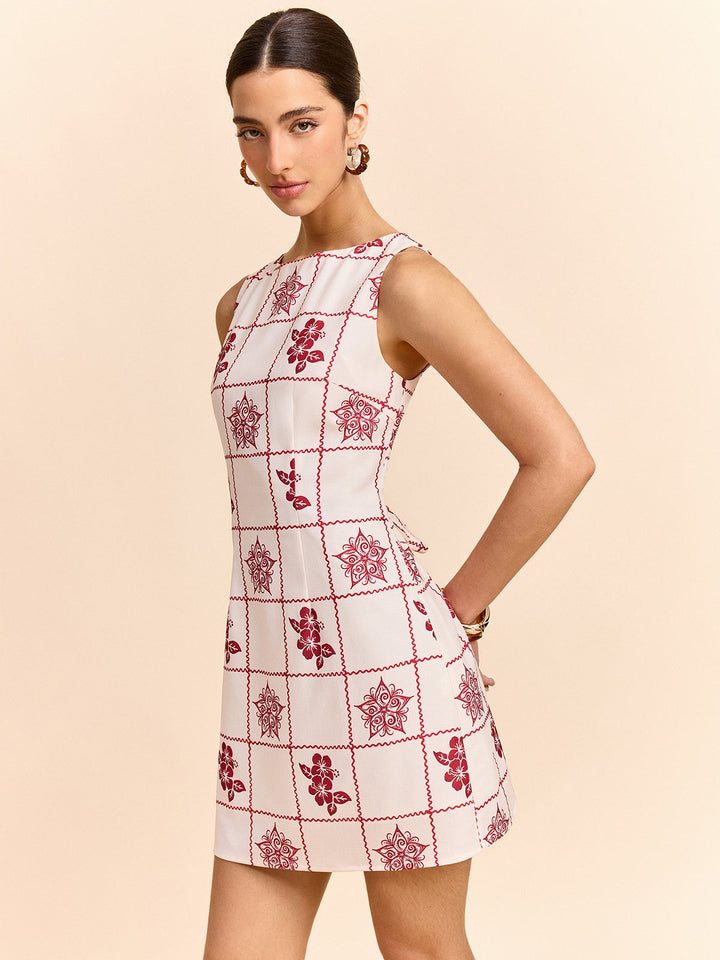 Kare Ve Çiçek Desenli Mini Elbise