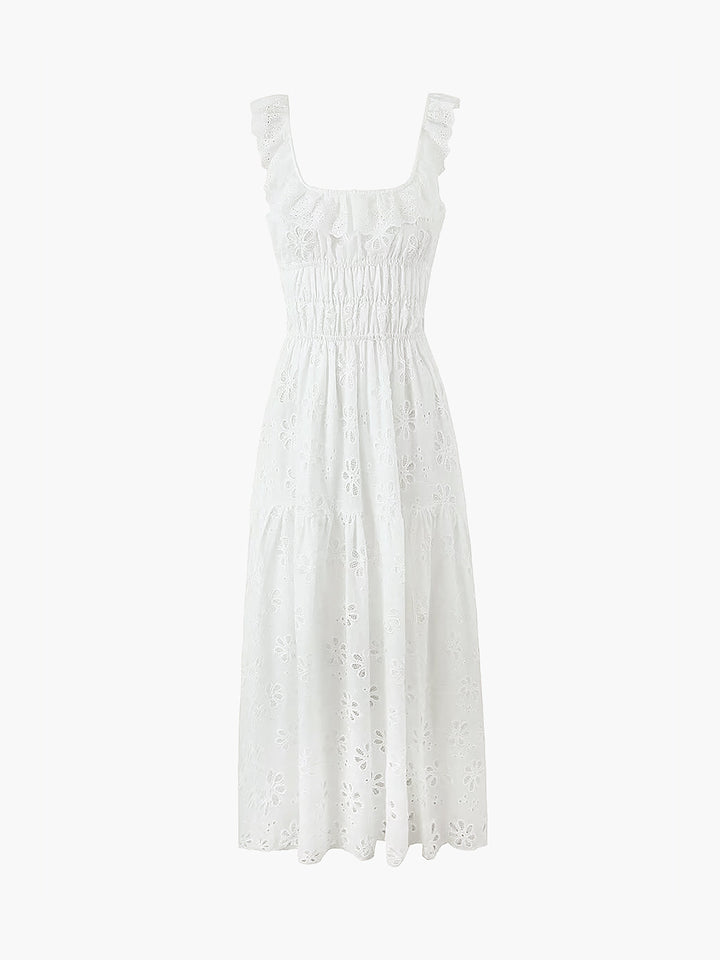 Güneşte Parıldayan Pamuklu İğne Oyası İşlemeli Uzun Elbise