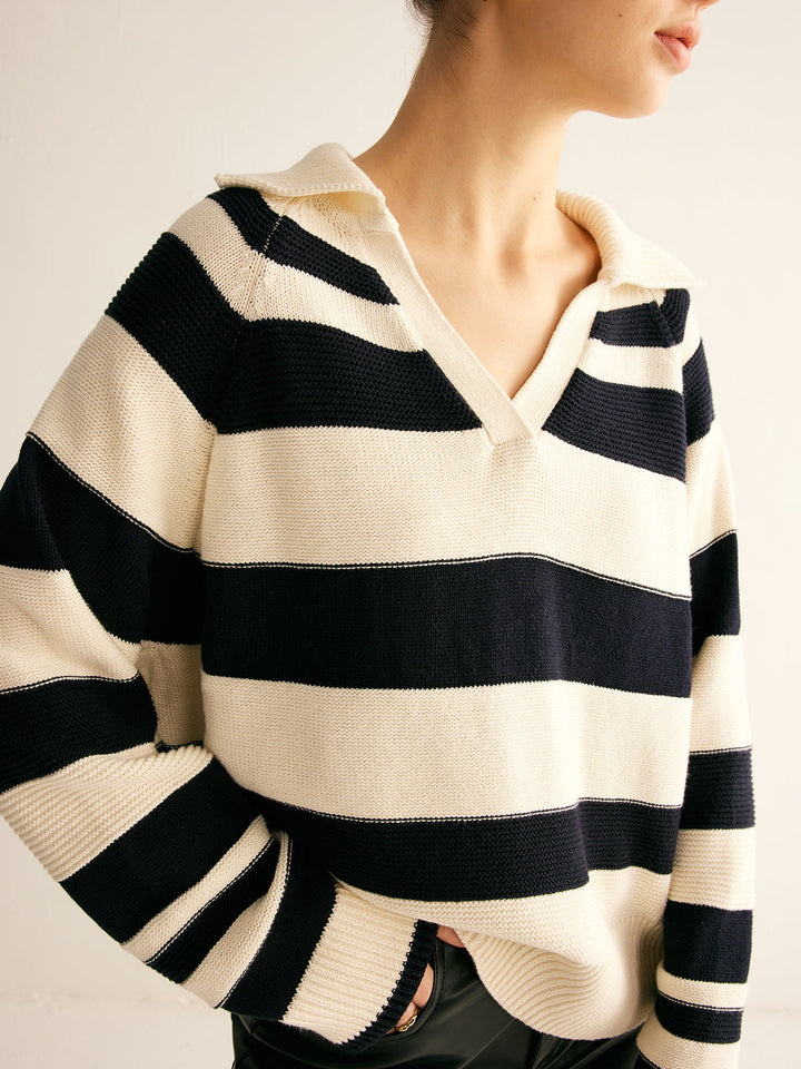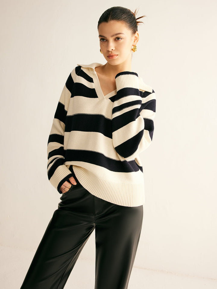 V Yaka İki Renkli Çizgili Polo Kazak