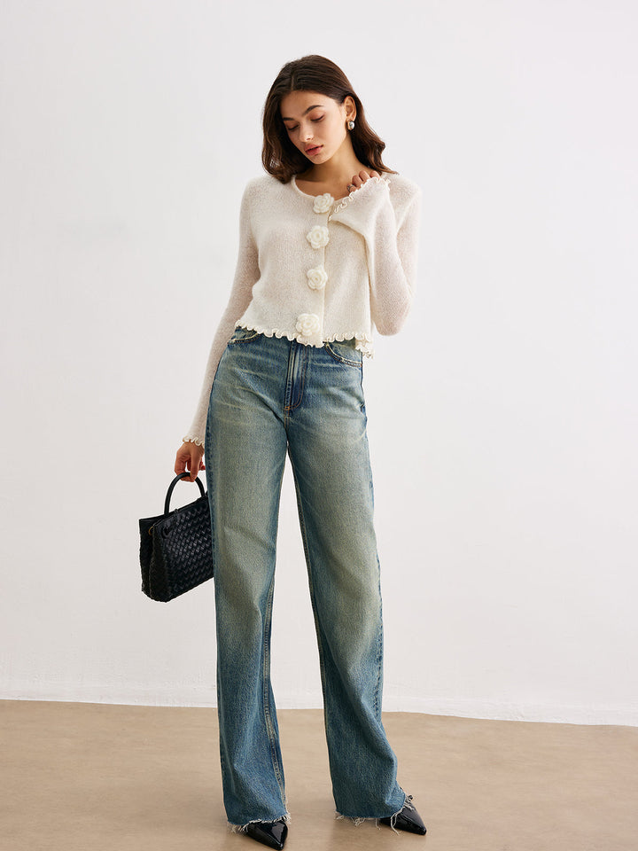 Yün Karışımlı Marul Kenarlı 3D Çiçekli Hırka